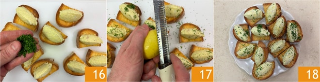 Garnissez de persil haché 16 et de zeste de citron râpé 17. Vos crostini avec brandade de morue sont prêts à être dégustés 18 !
