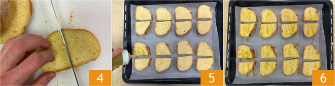 Divisez les tranches en deux 4, disposez-les sur une plaque recouverte de papier sulfurisé et arrosez-les d'huile 5. Faites cuire dans un four ventilé à 200° pendant 5 à 7 minutes 6.