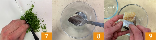 Hachez le persil au couteau 7. Égouttez la morue 8 et laissez tiédir, puis retirez la peau 9.