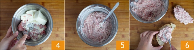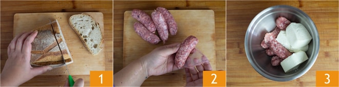 Pour préparer les crostini saucisse et stracchino, commencez par couper le pain en tranches de 2 cm d'épaisseur 1. Retirez la viande du boyau 2, transférez-la dans un bol et ajoutez le stracchino 3.
