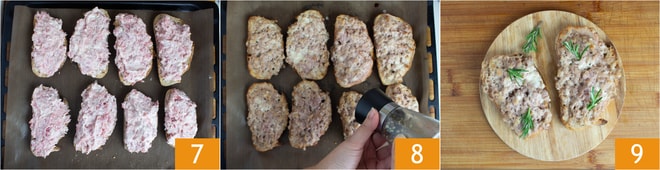 Disposez le pain sur une plaque recouverte de papier sulfurisé 7 et faites cuire à 200°C pendant 10-12 minutes ou jusqu'à ce que la viande soit cuite et qu'une croûte dorée se soit formée en surface. Terminez avec une pincée de poivre noir 8. Vos crostini saucisse et stracchino sont prêts à être dégustés 9.