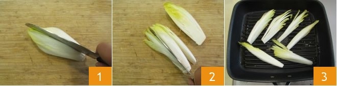 Pour préparer le croûton aux légumes et fromage, commencez par préparer les légumes grillés. Retirez les feuilles extérieures de l'endive, puis coupez-la en deux 1 et divisez à nouveau chaque moitié en 3 morceaux 2. Ensuite, placez une grille sur le feu, huilez-la et, une fois qu'elle est chaude, disposez-y les quartiers d'endive 3. Faites-les cuire environ 3-4 minutes en les retournant à mi-cuisson pour griller les deux côtés.