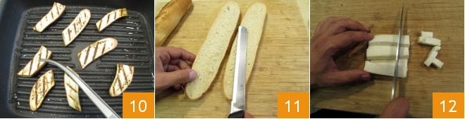 Dès qu'elles sont cuites 10, transférez-les dans une assiette. Prenez ensuite les deux baguettes 11 et divisez-les en deux 11. Coupez également le fromage de chèvre en cubes 12