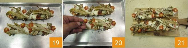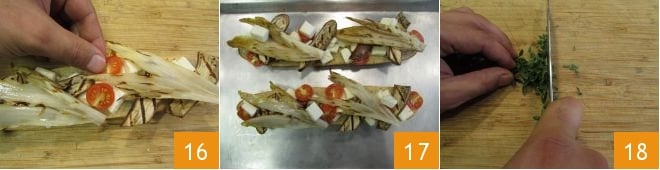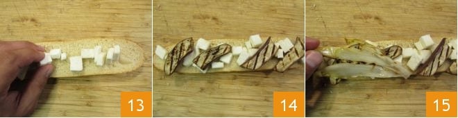 et disposez-les sur les baguettes, en en gardant quelques-uns de côté 13. Ajoutez les aubergines 14 et l'endive 15.