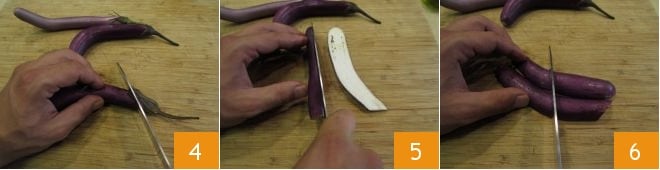 Pendant ce temps, lavez les aubergines perlina et séchez-les. Ensuite, coupez les extrémités 4 et divisez-les d'abord en deux dans le sens de la longueur 5 ; puis encore en deux dans l'autre sens : vous obtiendrez 4 morceaux 6.