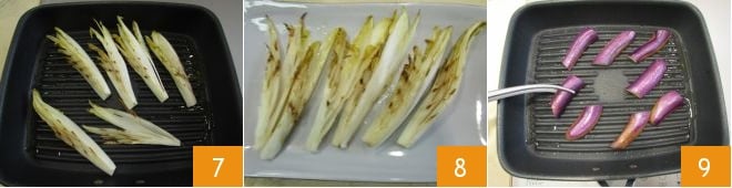 Dès que l'endive est bien grillée 7, transférez-la dans une assiette 8 ; huilez à nouveau la grille et faites-y griller également les aubergines 9. Cela prendra environ 3-4 minutes, retournez-les toujours à mi-cuisson pour les rôtir uniformément.