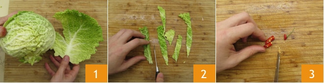 Pour préparer les croûtons avec chou frisé, casera et speck, commencez par nettoyer le chou frisé. Effeuillez-le 1 pour obtenir 200 g de feuilles et coupez en fines lanières de quelques centimètres 2. Ensuite, émincez finement le piment et passez aux fourneaux 3.