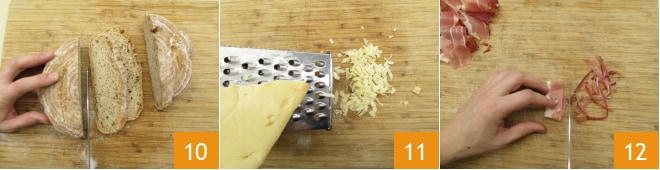Pendant ce temps, préchauffez le four et obtenez 6 tranches du morceau de pain en coupant à environ 1,5 cm d'épaisseur 10. Puis râpez le casera avec une râpe à gros trous 11 et enfin découpez le speck en lanières 12.