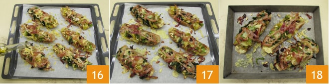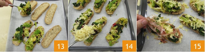 Passez à la composition. Disposez le pain sur une plaque recouverte de papier sulfurisé et garnissez avec le chou frisé 13, puis avec le fromage 14 et le speck 15.