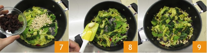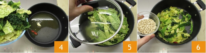 Dans une casserole, faites chauffer le piment et l'ail dans l'huile, puis plongez le chou frisé 4, ajustez le sel et couvrez avec le couvercle en laissant cuire à feu doux pendant 10 minutes 5. Retirez le couvercle et poursuivez la cuisson encore quelques minutes, en laissant sécher l'éventuel excès de liquide ; ajoutez les pignons de pin 6,