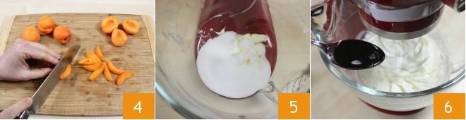 Répétez l'opération avec les abricots : coupez-les en deux, retirez le noyau et tranchez-les 4. Pour éviter que les fruits tranchés ne noircissent, transférez-les dans un bol et arrosez-les de jus de citron. Couvrez le bol de film plastique et mettez au frais jusqu'au moment de les utiliser. Préparez maintenant la pâte : mettez le beurre à température ambiante dans le bol d'un batteur avec le sucre 5 et allumez jusqu'à obtenir un mélange crémeux et mousseux; si vous n'avez pas de batteur, utilisez un mixer électrique ou un fouet. Ajoutez ensuite l'extrait de vanille 6, vous pouvez le remplacer par un sachet de vanilline ou une gousse de vanille. Ajoutez une pincée de sel et continuez à fouetter.
