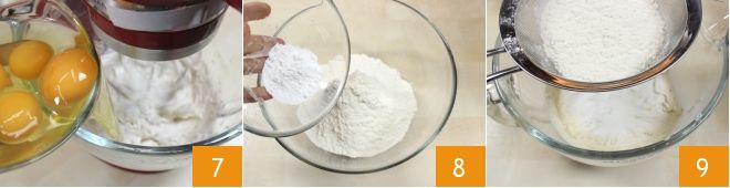 Continuez à fouetter, ajoutez un à un les œufs à température ambiante 7 et poursuivez pendant encore 2-3 minutes. Après ce temps, mélangez la levure et la farine 8 et incorporez-les, en les tamisant, au mélange de beurre et sucre 9. Ensuite, amalgamez le tout avec une spatule, jusqu'à ce que la consistance du mélange soit similaire à celle de la pâte à cake.