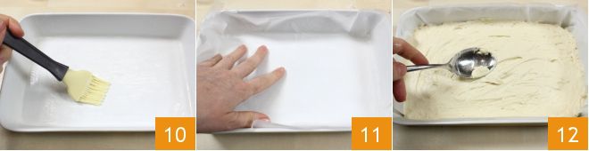 Beurrez un moule rectangulaire de 20x30 cm à l'aide d'un pinceau 10 et tapissez-le de papier sulfurisé 11, pour découvrir comment exécuter cette opération au mieux, consultez l'école de cuisine : comment tapisser un moule avec du papier sulfurisé. À ce stade, versez la pâte dans le moule et nivelez avec le dos d'une cuillère 12.