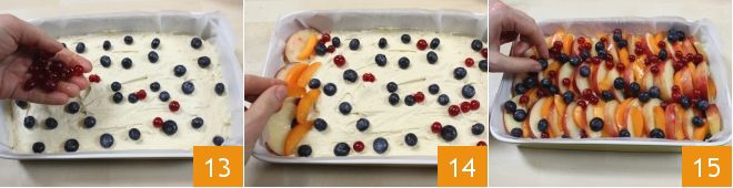 Maintenant, prenez les fruits lavés et tranchés que vous aviez mis de côté. Répartissez sur la surface la moitié des myrtilles et la moitié des groseilles 13, puis continuez à disposer les tranches de pêches et d'abricots de manière aléatoire ou en rangées alternées 14 et terminez en ajoutant l'autre moitié des groseilles et des myrtilles 15.