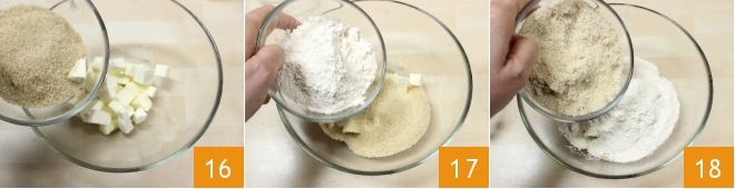 Préparez maintenant le crumble : dans un bol, versez le beurre froid coupé en cubes et ajoutez le sucre de canne 16. Ajoutez également la farine 00 17 et la farine d'amandes 18.