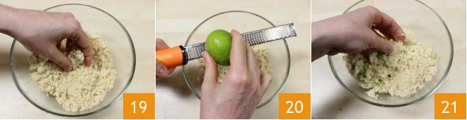 Mélangez du bout des doigts, en essayant d'amalgamer le tout en l'émiettant et sans insister trop longtemps pour éviter de faire fondre le beurre, et ajoutez deux grosses pincées de sel 19. Râpez le zeste d'un citron vert dans le mélange 20 et continuez à amalgamer du bout des doigts 21.