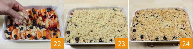 Transférez le crumble sur la couche de fruits 22 de manière uniforme 23 et enfournez dans un four statique préchauffé à 180° pendant environ 60 minutes, si vous utilisez un four ventilé, faites cuire à 160° pendant 50 minutes. Lorsque la couche de miettes sera légèrement dorée, votre crumb cake aux fruits d'été sera cuite 24. Sortez du four et laissez refroidir, puis coupez en cubes ou en tranches rectangulaires. Vous pouvez servir votre crumb cake aux fruits d'été, accompagnée d'une boule de glace à la vanille ou à la crème ou avec de la crème fouettée légèrement sucrée!