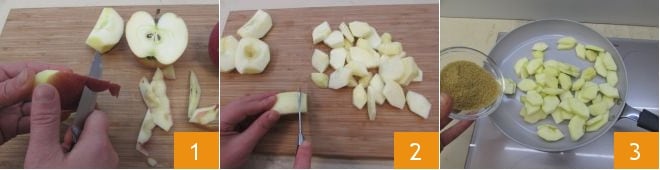 Pour préparer le crumble aux pommes avec sauce au chocolat, commencez par vous occuper des pommes. Lavez-les, épluchez-les 1, coupez-les d'abord en quartiers puis en tranches sur le côté le plus court 2. Transférez les pommes dans une casserole, ajoutez le sucre de canne 3
