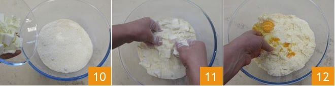 Ajoutez enfin le beurre coupé en dés 10 froid du réfrigérateur et commencez à pétrir en pinçant rapidement la pâte 11 pour ne pas trop la réchauffer. Ajoutez le jaune d'œuf et l'œuf entier 12