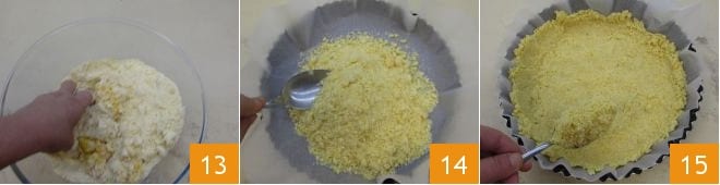 et continuez à pétrir 13 jusqu'à obtenir une pâte friable. Transférez un peu plus de la moitié de la pâte dans un moule de 22 cm tapissé de papier sulfurisé 14 et en pressant délicatement avec le dos d'une cuillère, étalez-la sur toute la surface, y compris les bords 15.