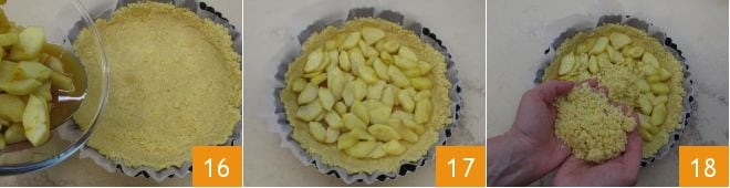 Versez les pommes à l'intérieur du moule 16, disposez-les de manière uniforme 17 et recouvrez avec le reste de la pâte 18.