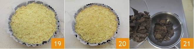 Cette fois, il ne sera pas nécessaire de presser avec la cuillère, mais simplement de recouvrir toute la surface avec les miettes, sans laisser d'espaces vides 19. Cuisez le crumble dans un four statique préchauffé à 180° pendant 30 minutes (ou dans un four ventilé préchauffé à 160° pendant environ 25 minutes). Sortez le gâteau du four 20, laissez-le tiédir et pendant ce temps, préparez la sauce au chocolat. Hachez le chocolat noir grossièrement et faites-le fondre 21 au bain-marie en remuant souvent.