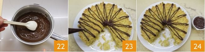 Une fois que le chocolat est complètement fondu 22, transférez-en une partie dans une poche à douille et décorez votre gâteau, selon votre goût 23. Servez le crumble aux pommes avec la sauce au chocolat restante 24.