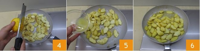 le zeste d'une demi-orange 4 et le jus 5. Laissez cuire de cette manière pendant environ 10 minutes à feu doux : les pommes ne doivent pas s'écraser mais rester croquantes 6. Ensuite, transférez-les dans un bol et laissez-les refroidir.