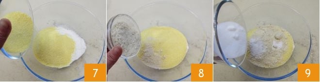 Passez maintenant à la préparation du crumble : dans un bol, mélangez la farine 00, la farine de maïs 7, la farine d'amandes 8 et le sucre 9.