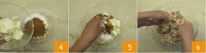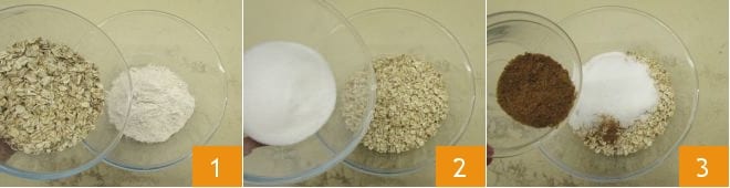 Pour réaliser le crumble aux pommes avec flocons d'avoine, commencez par préparer le crumble : dans un grand bol, mélangez la farine complète, les flocons d'avoine 1, le sucre en poudre 2, le sucre muscovado 3,