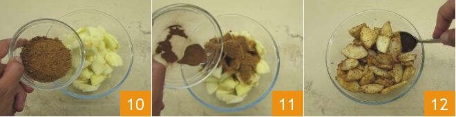 Transférez les pommes dans un bol, ajoutez le sucre muscovado 10 et la cannelle 11 et mélangez avec une cuillère 12.