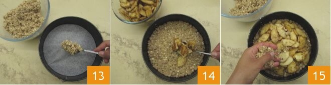 Prenez maintenant un moule de 20 cm de diamètre, tapissez le fond de papier sulfurisé et versez la moitié de la pâte à crumble à l'intérieur 13 : essayez de créer une couche uniforme en compactant légèrement la pâte avec les doigts. Répartissez la garniture sur la base en laissant un espace libre de 1 cm le long du bord 14, puis recouvrez le tout avec le reste de crumble 15.