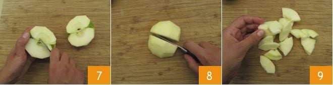 Passez à la préparation de la garniture : épluchez les pommes, coupez-les en deux et retirez le trognon 7, puis coupez-les en quartiers 8 et enfin en tranches fines 9.