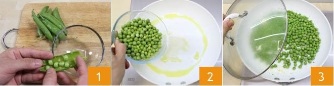 Pour réaliser le crumble de légumes, écossez les petits pois 1, puis dans une poêle faites revenir une gousse d'ail avec un filet d'huile et versez les petits pois écossés 2, couvrez avec le couvercle 3 et faites cuire pendant environ 10 minutes, si nécessaire ajoutez une louche de bouillon de légumes pour éviter qu'ils ne sèchent trop.