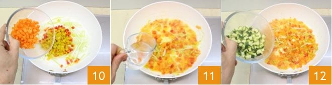 et jaunes, les carottes 10 et faites cuire pendant 5-6 minutes puis versez l'eau chaude 11 ou le bouillon de légumes et ajoutez les courgettes en dés 12