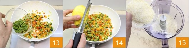 et les deux cuillères de petits pois 13 que vous avez mises de côté. Continuez pendant encore 5 minutes puis ajustez le sel et le poivre et parfumez avec le zeste de citron râpé 14 et le romarin. Maintenant, occupez-vous du crumble : mettez dans le mixeur les farines, le parmesan râpé 15