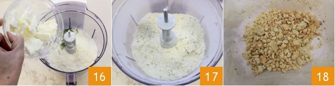 le beurre froid en morceaux 16, le romarin et une pincée de sel, actionnez les lames pendant quelques instants juste le temps nécessaire pour créer une pâte sableuse 17, étalez-la uniformément sur une plaque recouverte de papier sulfurisé et faites cuire dans un four statique à 160° pendant 15 minutes (ou dans un four ventilé à 140° pendant 10 minutes). Une fois la cuisson terminée, sortez le crumble du four et laissez-le refroidir 18.