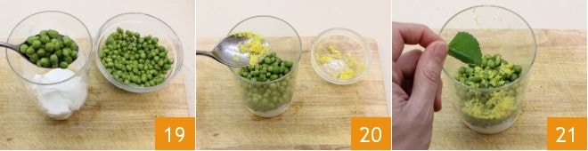 Pour finir, préparez la crème de petits pois : mettez le yaourt grec dans un récipient à bords hauts, versez les petits pois 19 (si vous ne l'aimez pas, retirez préalablement la gousse d'ail) assaisonnez avec le zeste de citron 20 et les feuilles de menthe 21