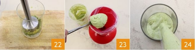 puis mixez avec le mixeur plongeant pour obtenir une préparation crémeuse 22. Transférez la crème dans une poche à douille 23 et versez-en une couche 24 dans des verrines en verre d'une capacité d'environ 185 g.