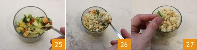 Puis recouvrez avec une deuxième couche de légumes 25 et terminez en recouvrant la surface de crumble salé 26. Le crumble de légumes est prêt, décorez-le avec un brin de romarin 27, mettez-le au réfrigérateur jusqu'au moment de servir et dégustez-le à température ambiante.