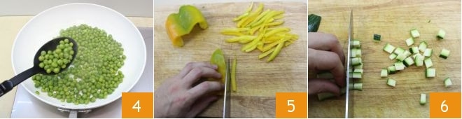 Salez, poivrez à votre goût et prélevez quelques cuillères de petits pois à ajouter aux autres légumes 4. Coupez les poivrons en deux puis réduisez-les en fines lamelles 5, équeutez les courgettes et coupez-les en petits dés 6,