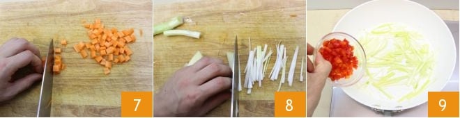 faites de même avec les carottes 7 et ensuite réduisez en fines lamelles les oignons nouveaux 8. À ce stade, faites revenir l'oignon dans une poêle avec un filet d'huile, puis ajoutez les poivrons rouges 9