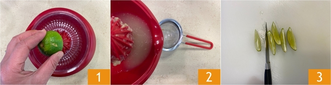 Pour préparer le Cuba libre, commencez par le citron vert. Pressez son jus à l'aide d'un presse-agrumes 1 et passez le liquide obtenu à travers une passoire 2. Coupez le citron vert en quartiers 3 qui serviront à décorer le cocktail.