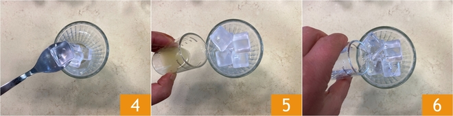 Dans un verre highball, ajoutez les glaçons 4, versez la moitié du jus de citron vert 5 et ajoutez également la moitié du rhum blanc 6.