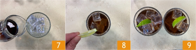 Il ne reste plus qu'à verser le Coca-Cola 7. Sachez qu'avec nos doses, vous obtiendrez 2 cocktails. Décorez et parfumez votre cocktail avec des quartiers de citron vert 8 et vous pouvez déjà savourer votre Cuba Libre bien frais 9 !
