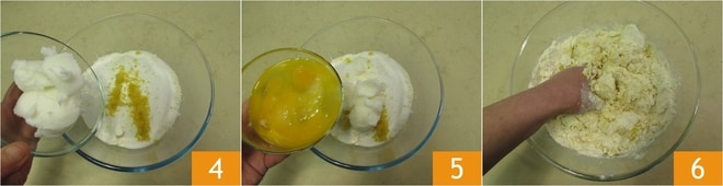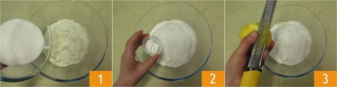 Pour préparer les cuddura cull'ova, mettez la farine dans un grand bol, ajoutez le sucre 1, la levure tamisée 2 et le zeste de citron râpé 3.