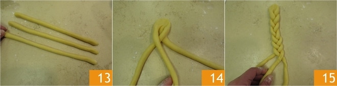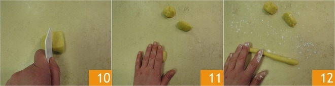 Divisez-la en 3 parties 10. Prenez la première portion et, avec un peu de farine, formez un bâtonnet 11 12.