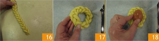 Appuyez délicatement pour fermer la fin de la tresse. Soulevez-la délicatement 16 et transférez-la sur une plaque, en la fermant en cercle et en pinçant délicatement l'une des deux extrémités sur l'autre 17. Lavez bien les œufs pour la décoration, séchez-les et placez-en un au centre de la cuddura en appuyant doucement 16.