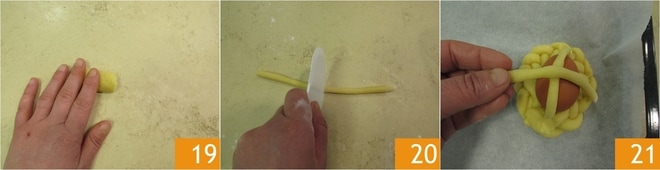 Prélevez une petite portion de pâte et formez un bâtonnet 19. Divisez-le en deux et placez-le sur l'œuf de manière à former une croix 21. Appuyez ensuite délicatement sur la pâte pour bien la faire adhérer 21