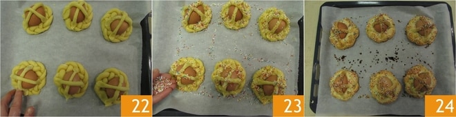 Continuez de cette manière jusqu'à épuiser la pâte, vous obtiendrez 10 cuddura 22. Placez-les au fur et à mesure sur la plaque en les espaçant trois par trois. Badigeonnez avec l'œuf et décorez avec les petits sucres colorés 23. Faites cuire au four statique préchauffé à 200° pendant environ 20-25 minutes. Sortez du four 24 et laissez refroidir avant de servir !
